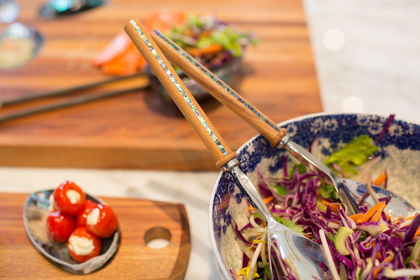 Designed to complement vibrant, colourful salads, these servers blend the warmth of native timber with the iridescent shimmer of pāua – creating a truly distinctive and tasteful piece of New Zealand homeware.