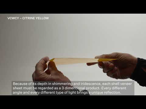 This Ocean Shell veneer features genuine white mother of pearl enhanced with a citrine yellow tint, producing a vibrant, reflective golden-yellow tone with luminous depth. The flat sheet is approximately 0.3mm thick and is available in a gloss finish. The gloss coating intensifies the rich colour and creates a brilliant surface that catches the light with radiant warmth.