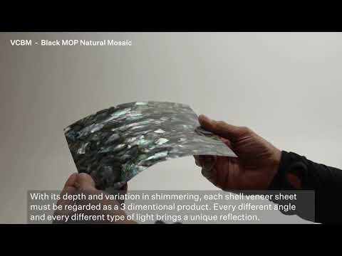 This Ocean Shell veneer features genuine black mother of pearl arranged in a mosaic pattern to highlight its deep, natural beauty and shimmering iridescence. The flat sheet is approximately 0.3mm thick and finished with a gloss coating that enhances the shell’s rich, dark tones and layered texture.