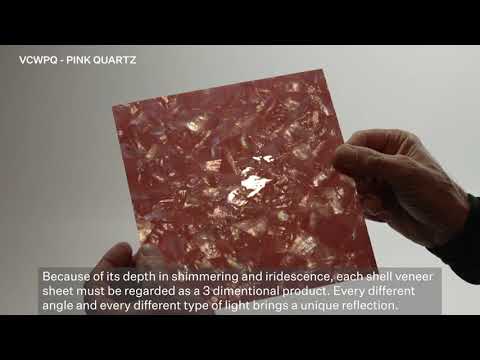 This Ocean Shell veneer features genuine white mother of pearl enhanced with a Pink Quartz Tint, producing a soft, shimmering pink tone with gentle iridescence and natural depth. The flat sheet is approximately 0.3mm thick and is available in a gloss finish. The gloss coating enhances the light play across the surface, giving the veneer a radiant and refined appearance.
